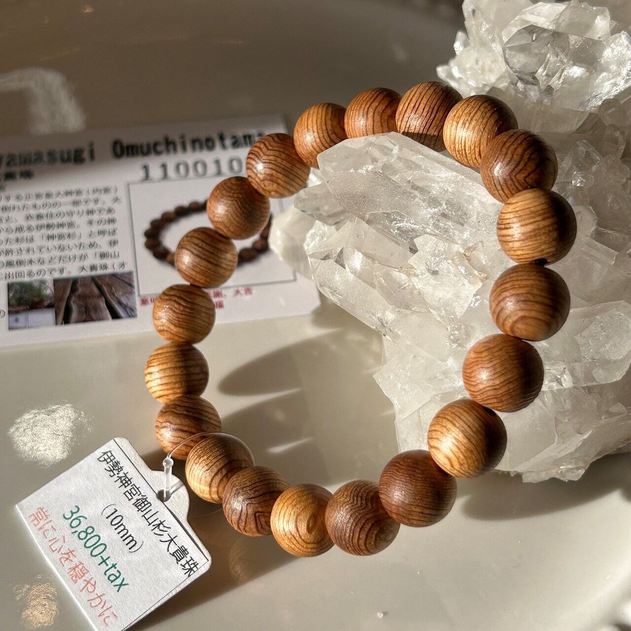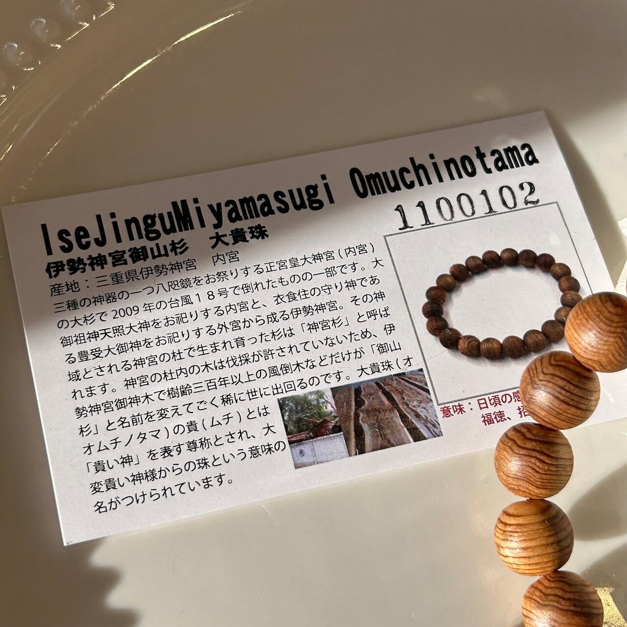 この伊勢神宮御山杉は、その名の通り”伊勢神宮”で生まれ育った杉の木から削り出されたもので、普通に手に入れられる杉のビーズとは稀少価値が桁違いに高いものです。