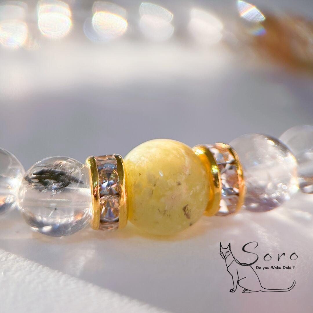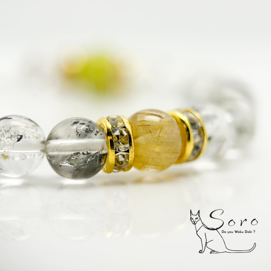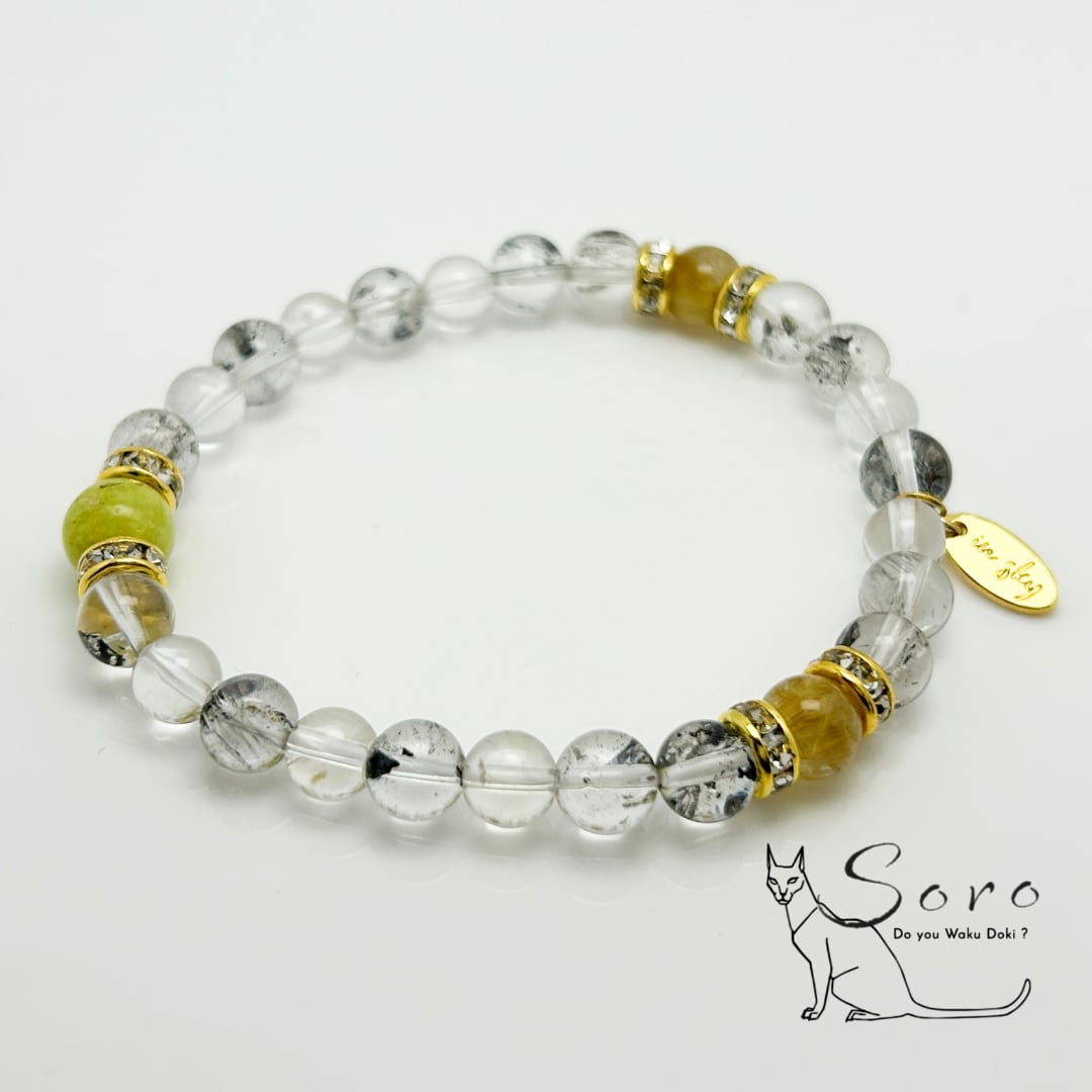 やわらかく穏やかなグリーンが印象的なサーペンティンを主役に、前向きなエネルギーを象徴するルチルクォーツ、長い年月を経て形成されたエレスチャルクォーツ、そして全体を調和させる水晶を組み合わせました。