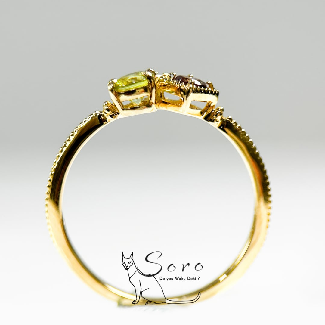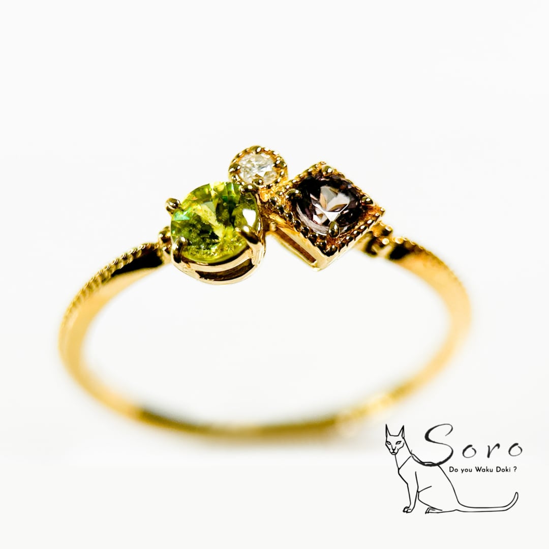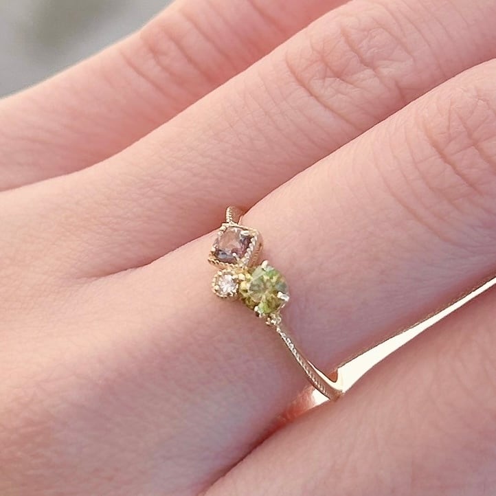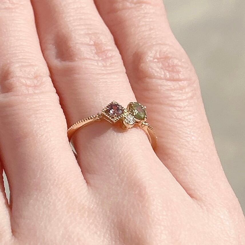 光の当たり方で表情を変えるカラーチェンジガーネットに、サファイアとダイヤモンドを添えた特別なリング。